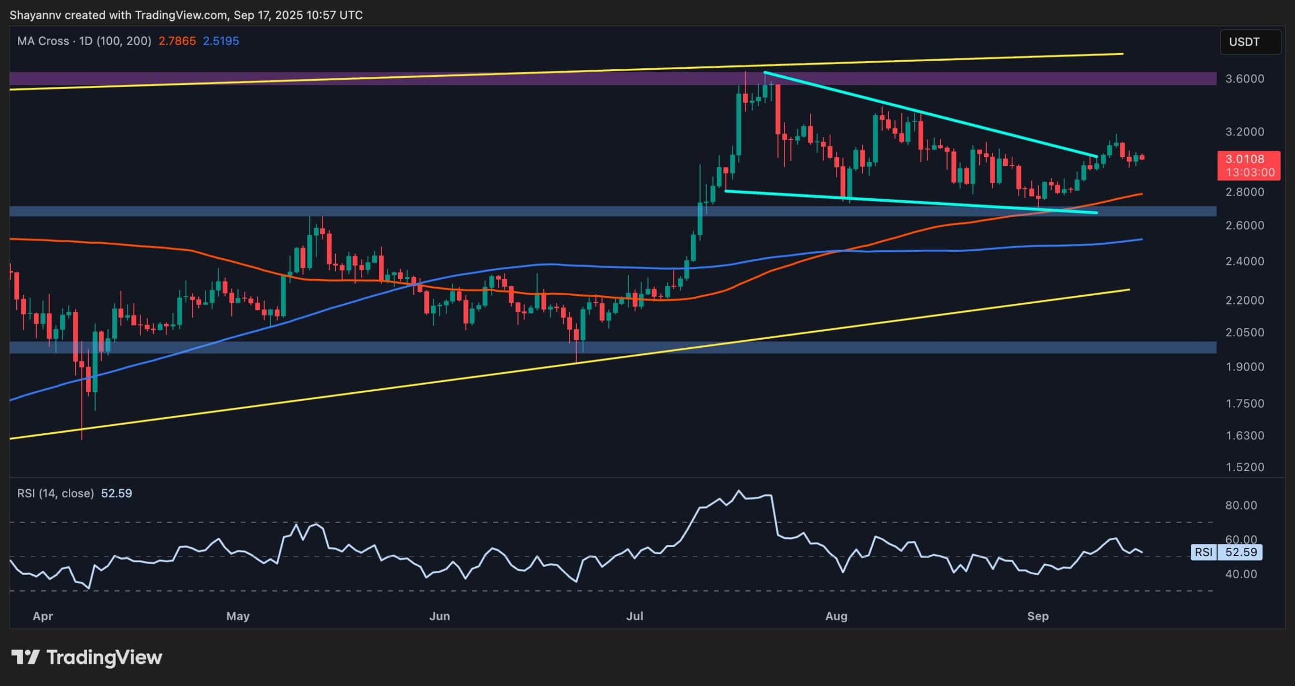 On the XRP/USDT paired chart, the asset has been consolidating on the each day timeframe since a decisive rejection from the $3.60 resistance degree again in July. This space capped Ripple’s main worth rally, dragging it from under $2 to above $3. But, following the rejection, the asset has pulled again and retested the $2.70 demand zone a number of occasions, and located help every time.