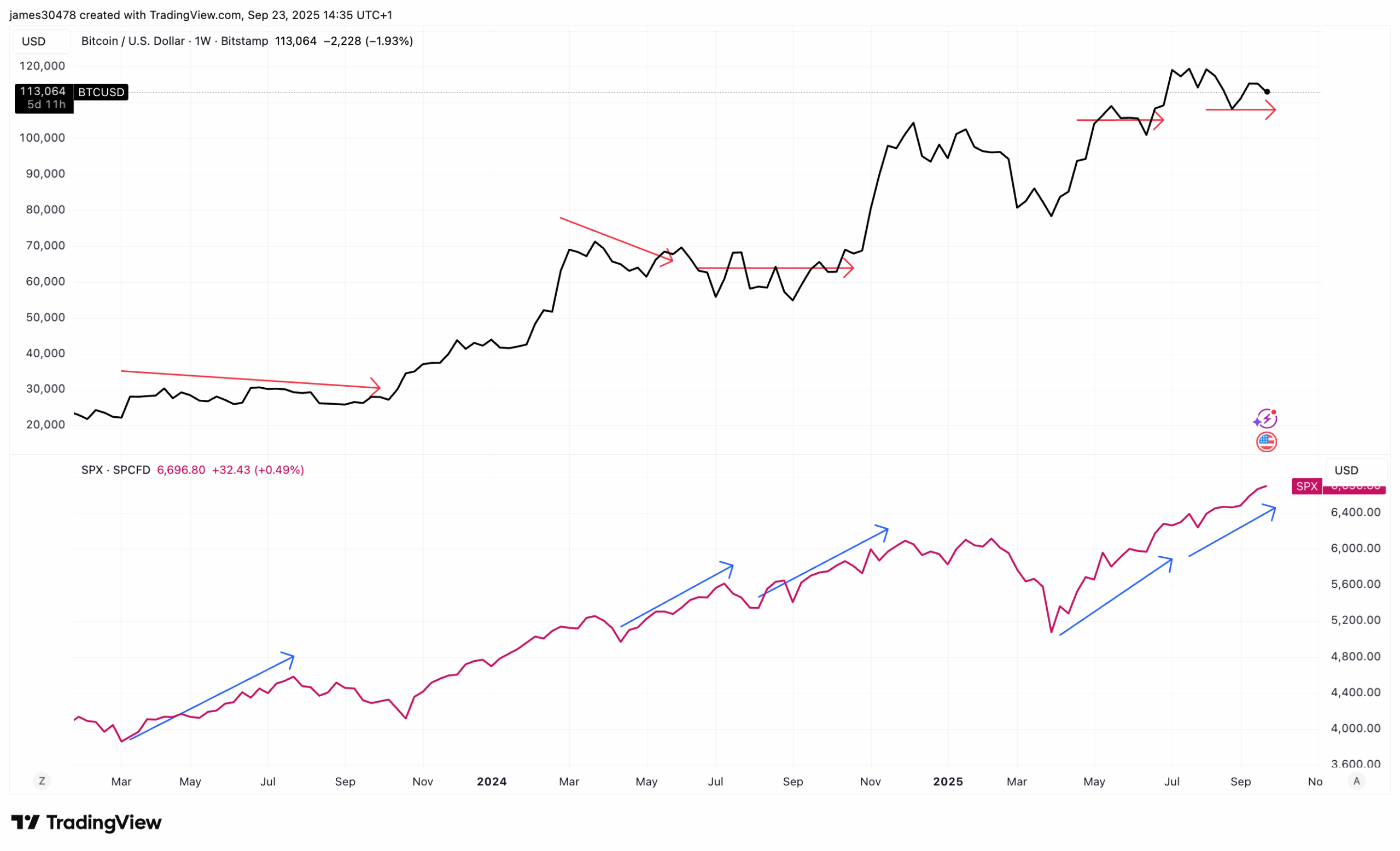 The second divergence came about later that 12 months when the S&P 500 rallied from 5,200 to six,000 from April to October. with solely a short summer season pause. Bitcoin, nonetheless, didn’t comply with, with its rally not starting till November (alongside the presidential election outcomes).