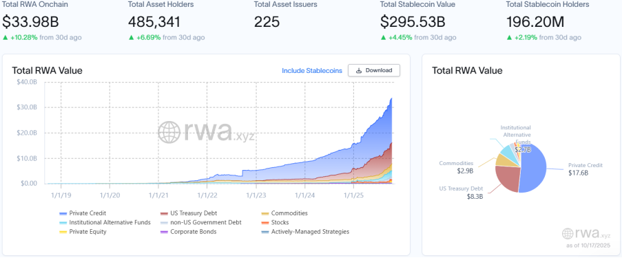 In accordance with the most recent knowledge from RWA.xyz, as of October 17, 2025, the entire market capitalization of the RWA chain reached US$33.98 billion, a month-on-month enhance of 10.28%; the entire variety of asset holders elevated to 485,300, a month-on-month enhance of 6.69%; the entire variety of asset issuers dropped to 225, indicating that market focus is accelerating – the dominance of main establishments is growing, whereas small and medium-sized issuers proceed to filter.