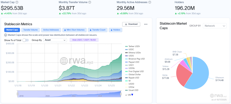 The entire market capitalization of stablecoins reached $295.53 billion, up 4.45% month-over-month, with development additional slowing. Month-to-month switch quantity jumped considerably to $3.87 trillion, a 22.79% enhance month-over-month, ending a interval of decline and signaling a robust rebound in institutional settlement demand. The entire variety of month-to-month lively addresses elevated to 29.56 million, up 8.88% month-over-month. The entire variety of holders reached roughly 196 million, a slight enhance of two.19% month-over-month. The divergence between the 2 continues, indicating a deepening structural divergence between institutionalization and retail retreat. The main stablecoins had been USDT, USDC, and USDe. USDT’s market capitalization elevated by 5.66% month-over-month, whereas USDC’s market capitalization noticed a slight enhance of three.03%. Maybe as a result of market crash, USDe’s market capitalization noticed its first decline, down 7.26% month-over-month.