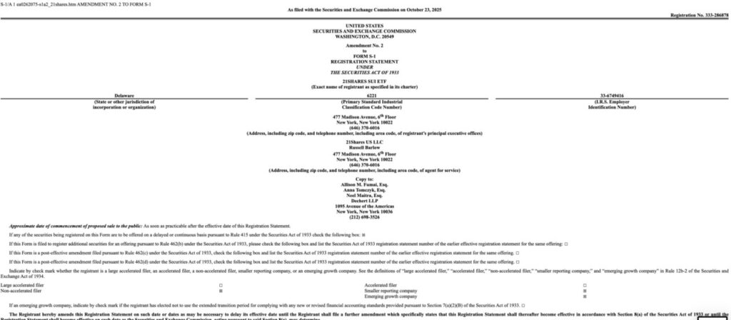 Based mostly on documents filed with the US Securities and Alternate Fee (SEC), 21Shares filed the second modification to the S-1 type for his or her spot Sui ETF software after market shut on October 23.