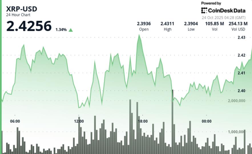 • Hourly information present a gentle upward bias, with XRP advancing from $2.397 to $2.405 round 01:47 on elevated quantity.