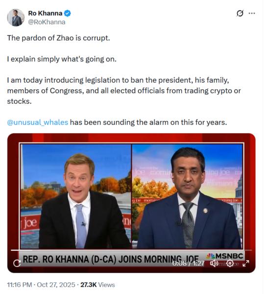 Khanna alleged that the Binance co-founder was being let off the hook due to Binance’s monetary backing of WLFI — echoing current sentiments from US Consultant Maxine Waters.