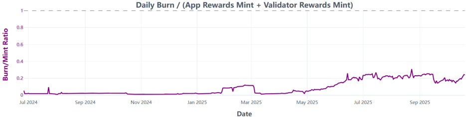 For Canton, the DAT technique, by packaging the funding in protocol tokens as a regulated monetary instrument, considerably alleviates institutional issues about cryptocurrency volatility or advanced regulatory guidelines. This not solely lays the groundwork for attracting each conventional capital and community incentives to develop concurrently, but additionally provides one other layer of worth accumulation to CC’s utility-driven mannequin. Up to now, CC’s burn/mint ratio has steadily elevated to 0.24.