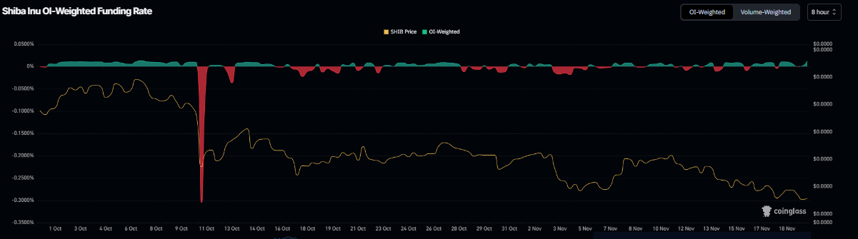 Aside from the undervalued circumstances, the derivatives knowledge additionally help a restoration rally for Shiba Inu. Coinglass’s OI-Weighted Funding Fee knowledge exhibits that the variety of merchants betting that the worth of SHIB will slide additional is decrease than these anticipating a worth enhance.