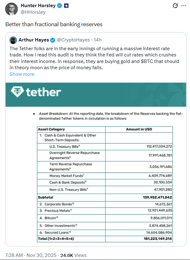 Curiously, trade voices responded rapidly. Bitwise CEO Hunter Horsley stated Tether’s construction is healthier than fractional banking reserves.