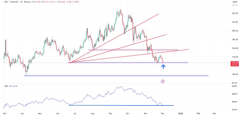 The chart confirmed a trendline beginning close to $16 in 2023 and rising by a number of increased lows. The present take a look at close to $125 is the fourth interplay with the road. Traditionally, this stage has marked robust accumulation earlier than large upside extensions. Ali stated holding this line might carry the same response.