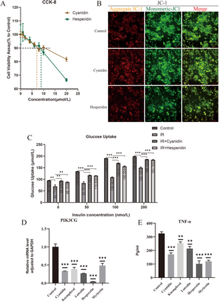 Cross-sectional outcomes confirmed that anthocyanidins and Flavanones have been considerably correlated with IR, whereas hesperidin represented a Flavanones compound current in exceptionally elevated concentrations in citrus fruits. Consequently, we chosen these two bioactive compounds as subsequent investigational targets. We used CCK-8 cell viability assay to investigate the results of cyanidin and hesperidin on the cell viability of 3T3-L1 adipocytes (Fig 7A). To bypass loss of life interference with glucose uptake evaluation, we selected concentrations beneath IC10 for subsequent research. IR cell fashions obtained 7µmol/L cyanidin or 9 µmol/L hesperidin, respectively, and have been cultured in full tradition medium containing 0, 50 and 100nmo/L insulin for 24h. JC-1 outcomes confirmed that the mitochondrial membrane potential of cells elevated after the addition of cyanidin and hesperidin (Fig 7B). As proven in Fig 7C, management group glucose uptake elevated proportionally with insulin concentrations, whereas IR group glucose uptake decreased considerably in contrast with the management group at equal insulin content material. Following cyanidin and hesperidin administration, glucose uptake recovered considerably throughout various insulin concentrations in contrast with IR group, reflecting improved IR. Additional experimental outcomes demonstrated that, in addition to cyanidin and hesperetin, the opposite three flavonoids (kaempferol, luteolin, and myricetin) additionally considerably lowered PIK3 CG mRNA ranges (Fig 6D) and decreased TNF-α secretion in the tradition supernatant (Fig 6E) at a focus of 5μmol/L. These findings counsel that dietary flavonoids may share a standard mechanism in ameliorating insulin resistance, doubtlessly by their anti-inflammatory results.