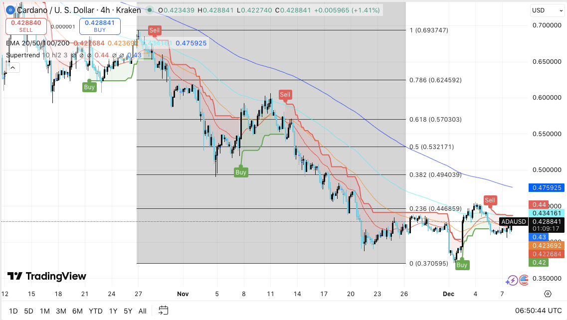 Draw back ranges: $0.423–$0.426 native assist cluster, adopted by $0.42 psychological assist. A deeper breakdown exposes the foremost swing low at $0.37.