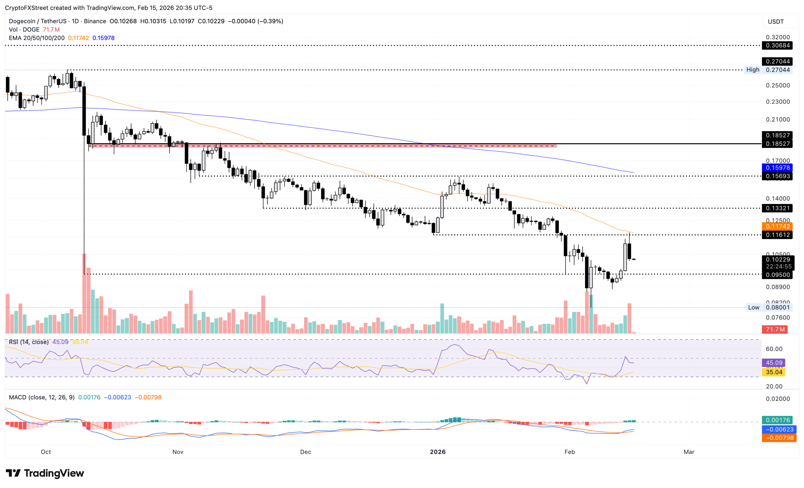 The trail of least resistance targets the October 10 low at $0.0950, adopted by a deeper zone on the February 6 low of $0.0800.