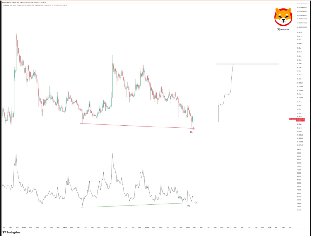 “With SHIB’s RSI making larger lows whereas its costs type decrease lows, that is thought of an everyday bullish divergence in technical evaluation and suggests a powerful chance for a bullish reversal.” He wrote. “A reversal can lead to Shiba Inu recovering over 400% into the $0.000035 areas.”